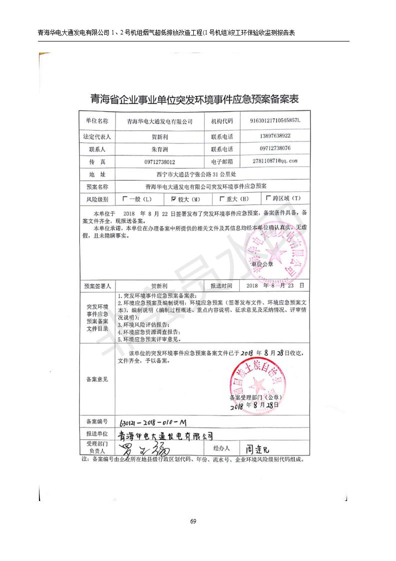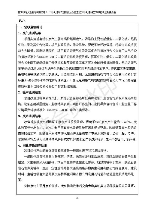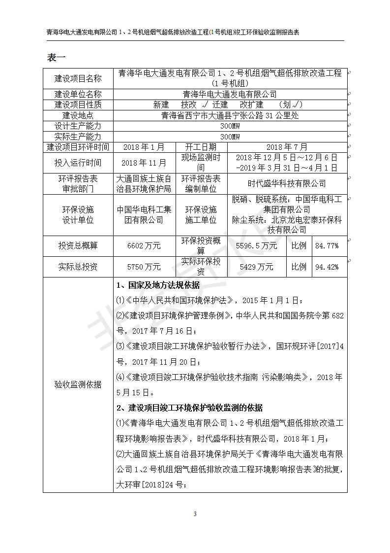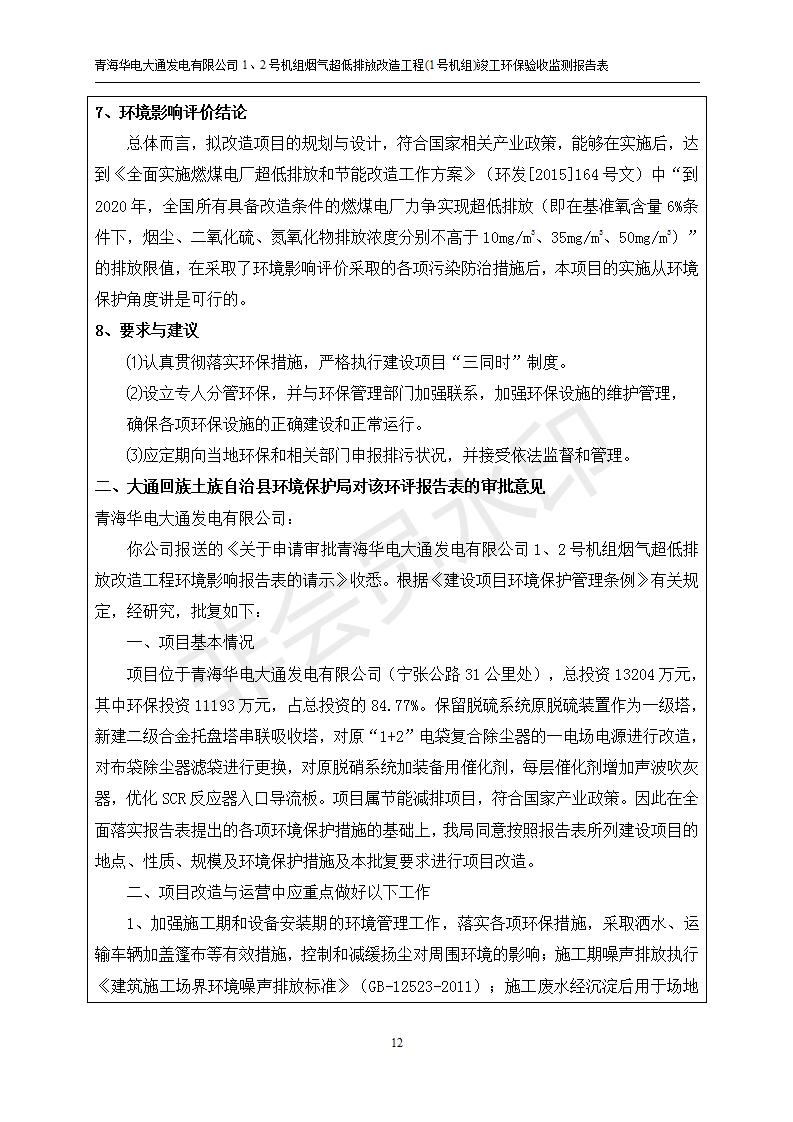 根據(jù)中華人民共和國(guó)國(guó)務(wù)院令第682號(hào)《國(guó)務(wù)院關(guān)于修改〈建設(shè)項(xiàng)目環(huán)境保護(hù)管理?xiàng)l例〉的決定》和《建設(shè)項(xiàng)目竣工環(huán)境保護(hù)驗(yàn)收暫行辦法》(國(guó)務(wù)院令682號(hào)),青海華電大通發(fā)電有限公司1、2號(hào)機(jī)組煙氣超低排放改造工程(1號(hào)機(jī)組) (包括竣工環(huán)境保護(hù)驗(yàn)收監(jiān)測(cè)報(bào)告表和驗(yàn)收意見)公示如下。 一、項(xiàng)目名稱:青海華電大通發(fā)電有限公司1、2號(hào)機(jī)組煙氣超低排放改造工程(1號(hào)機(jī)組) 竣工環(huán)境保護(hù)驗(yàn)收監(jiān)測(cè)報(bào)告表 二、地點(diǎn):青海省西寧市大通縣寧張公路31公里處 三、建設(shè)單位:青海華電大通發(fā)電有限公司 四、建設(shè)內(nèi)容:1號(hào)機(jī)組煙氣超低排放改造,1號(hào)機(jī)組改造內(nèi)容為脫硫系統(tǒng)保留原脫硫裝置作為一級(jí)塔,新建二級(jí)合金托盤塔串聯(lián)吸收塔;對(duì)原“1+2”電袋復(fù)合除塵器的一電場(chǎng)電源進(jìn)行改造,對(duì)布袋除塵器濾袋進(jìn)行更換;對(duì)原脫硝系統(tǒng)選擇性催化還原法(SCR)脫硝工藝加裝備用催化劑,每層催化劑增加聲波吹灰器,優(yōu)化SCR反應(yīng)器入口導(dǎo)流板。 五、聯(lián)系人:張工 六、聯(lián)系電 話:0971-6515411 七、公示時(shí)間:二〇一九年二月十三日至二〇一九年三月十二日 公示期間,對(duì)上述公示內(nèi)容如有異議,請(qǐng)以書面形式反饋,個(gè)人須署真實(shí)姓名,單位須加蓋公章。