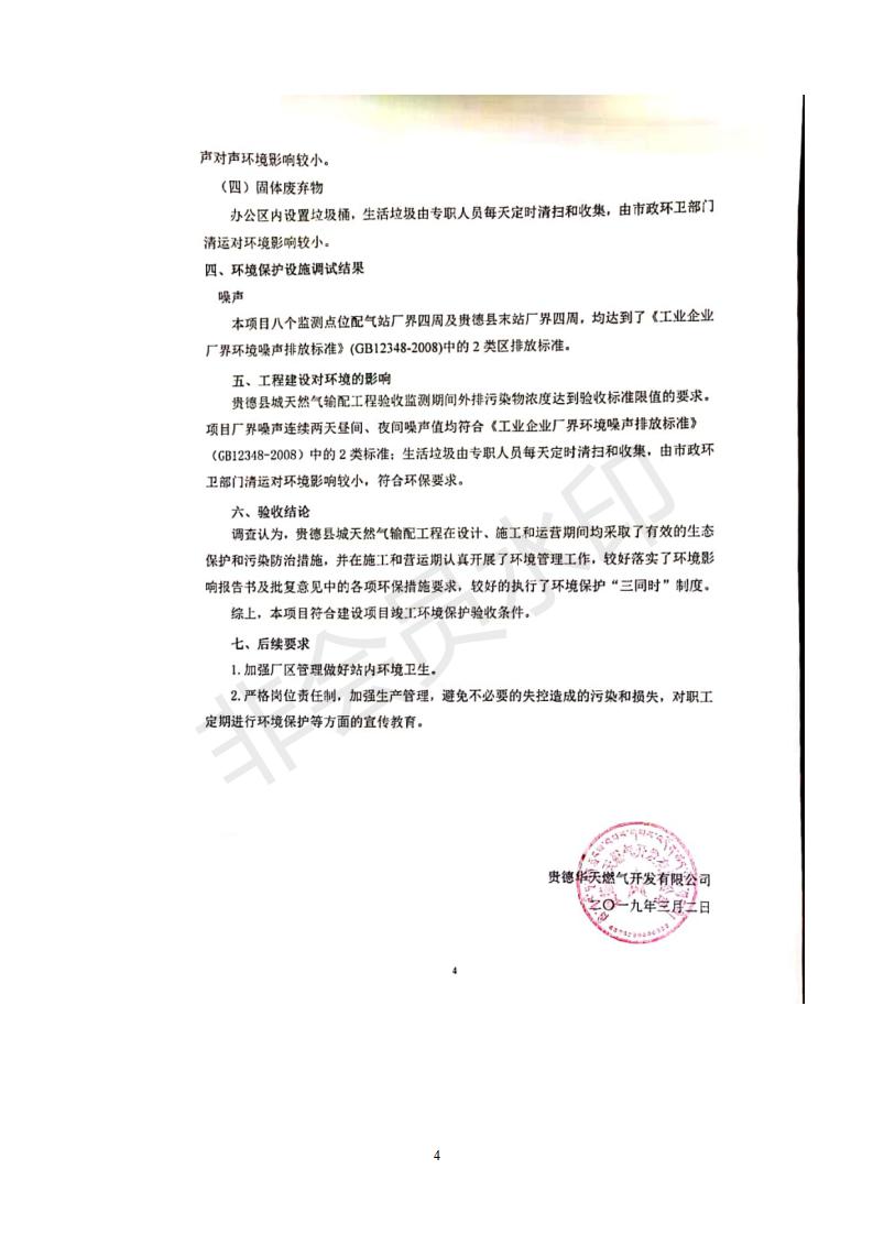 根據(jù)中華人民共和國(guó)務(wù)院令第682號(hào)《國(guó)務(wù)院關(guān)于修改〈建設(shè)項(xiàng)目環(huán)境保護(hù)管理?xiàng)l例〉的決定》和《建設(shè)項(xiàng)目竣工環(huán)境保護(hù)驗(yàn)收暫行辦法》(國(guó)務(wù)院令682號(hào)),貴德縣城輸配管線工程竣工環(huán)境保護(hù)驗(yàn)收內(nèi)容(包括竣工環(huán)境保護(hù)驗(yàn)收調(diào)查表和驗(yàn)收意見(jiàn))公示如下。 一、項(xiàng)目名稱(chēng):貴德縣城天然氣輸配工程 二、地點(diǎn):拉雞蓋澀寧蘭復(fù)線22#閥室-貴德縣城 三、建設(shè)單位:貴德華天燃?xì)忾_(kāi)發(fā)有限公司 四、建設(shè)內(nèi)容:貴德縣末站、貴德縣配氣站、貴德縣中壓管網(wǎng)、拉雞蓋22#閥室-貴德縣城長(zhǎng)輸管線 五、公示時(shí)間:二〇一九年三月十一日至二〇一九年四月八日 六、聯(lián)系人:張工 公示期間,對(duì)上述公示內(nèi)容如有異議,請(qǐng)以書(shū)面形式反饋,個(gè)人須署真實(shí)姓名,單位須加蓋公章。