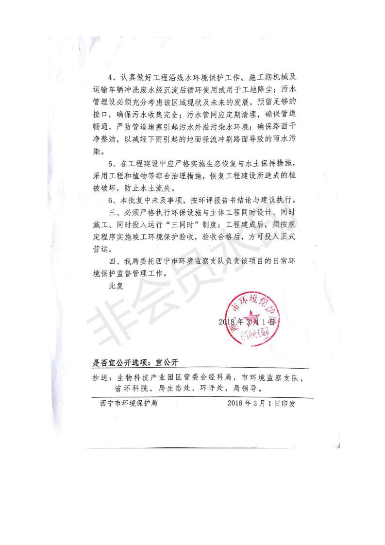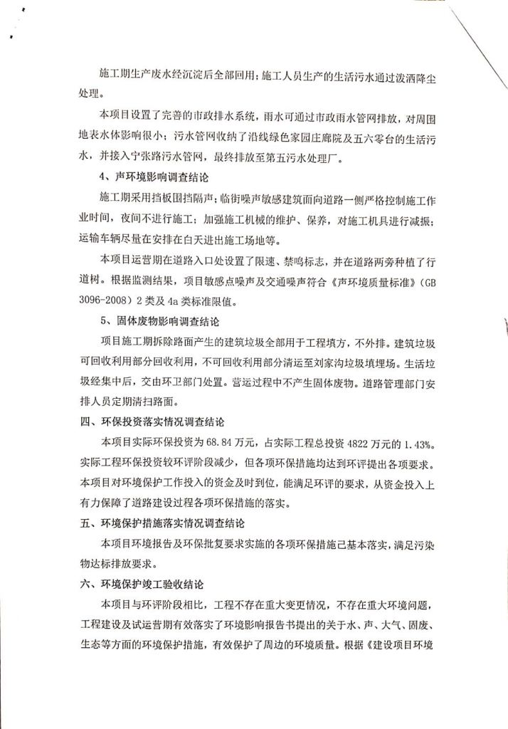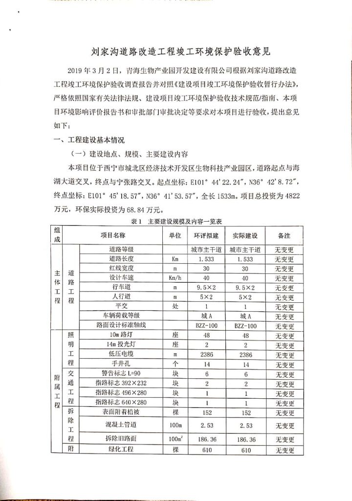 根據(jù)中華人民共和國(guó)務(wù)院令第682號(hào)《國(guó)務(wù)院關(guān)于修改〈建設(shè)項(xiàng)目環(huán)境保護(hù)管理?xiàng)l例〉的決定》和《建設(shè)項(xiàng)目竣工環(huán)境保護(hù)驗(yàn)收暫行辦法》(國(guó)務(wù)院令682號(hào)),劉家溝道路改造工程竣工環(huán)境保護(hù)驗(yàn)收內(nèi)容(包括竣工環(huán)境保護(hù)驗(yàn)收調(diào)查報(bào)告和驗(yàn)收意見)公示如下: 一、項(xiàng)目名稱:劉家溝道路改造工程 二、地點(diǎn):青海省西寧市城北區(qū)生物園區(qū) 三、建設(shè)單位:生物產(chǎn)業(yè)園開發(fā)建設(shè)有限公司 四、建設(shè)內(nèi)容:劉家溝道路經(jīng)改造后全長(zhǎng)1533m,道路呈東西向展布,道路紅線為30m。設(shè)計(jì)時(shí)速為40km/h,雙向4車道。 五、公示時(shí)間:二〇一九年三月十四日至二〇一九年四月十一日 六、聯(lián)系人:張工 公示期間,對(duì)上述公示內(nèi)容如有異議,請(qǐng)以書面形式反饋,個(gè)人須署真實(shí)姓名,單位須加蓋公章。