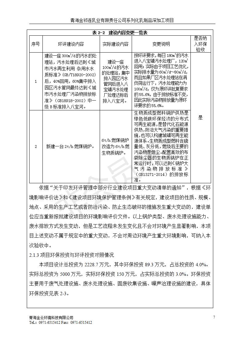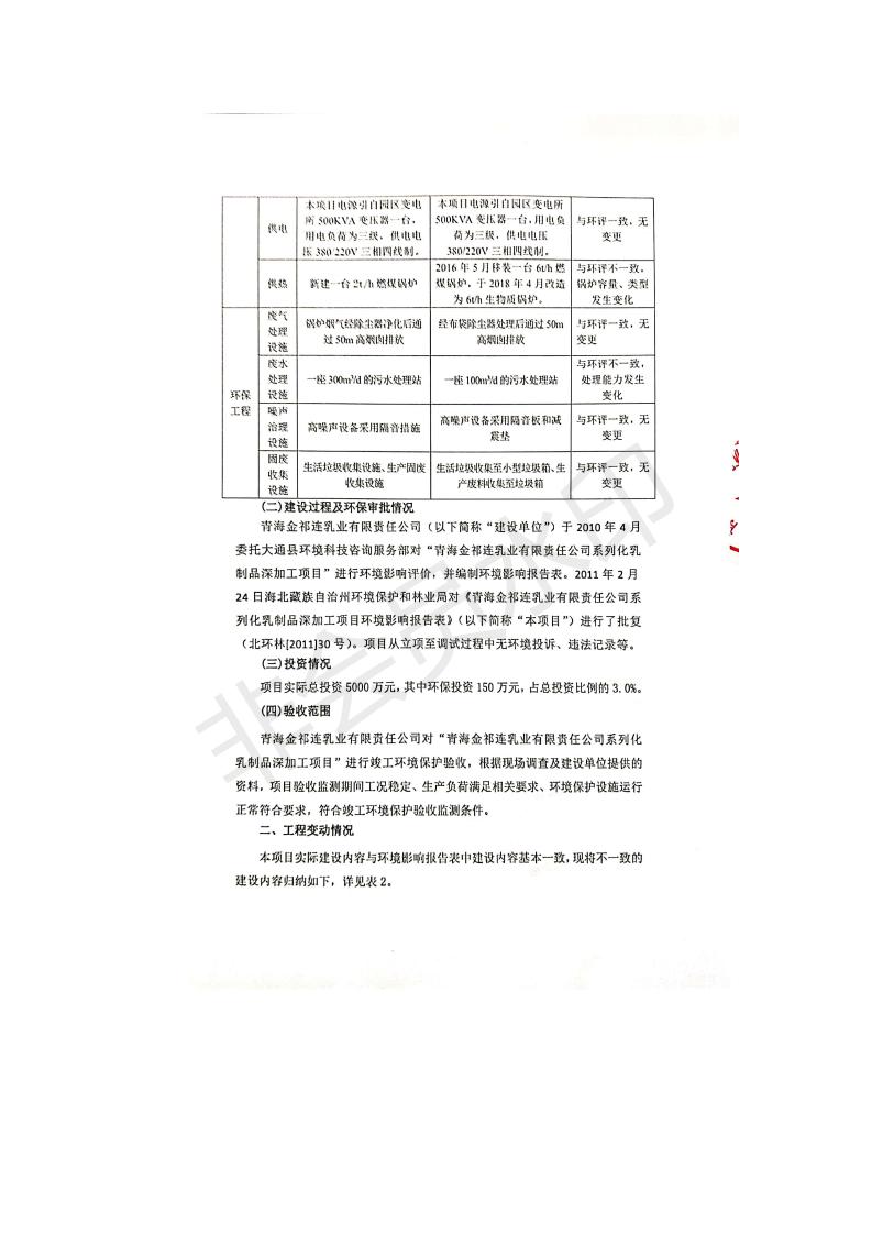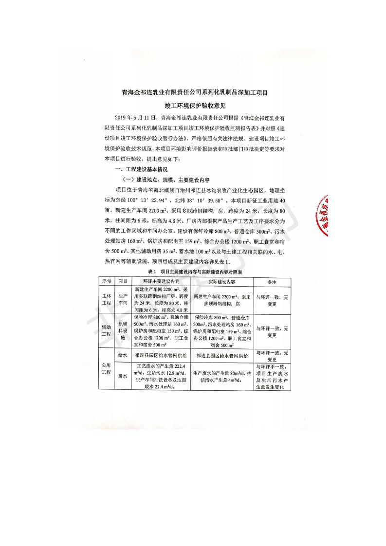 根據(jù)中華人民共和國國務(wù)院令第682號《國務(wù)院關(guān)于修改〈建設(shè)項(xiàng)目環(huán)境保護(hù)管理?xiàng)l例〉的決定》和《建設(shè)項(xiàng)目竣工環(huán)境保護(hù)驗(yàn)收暫行辦法》(國務(wù)院令682號),青海金祁連乳業(yè)有限責(zé)任公司系列化乳制品深加工項(xiàng)目(包括竣工環(huán)境保護(hù)驗(yàn)收監(jiān)測報(bào)告表和驗(yàn)收意見)公示如下。 一、項(xiàng)目名稱:青海金祁連乳業(yè)有限責(zé)任公司系列化乳制品深加工項(xiàng)目 二、地點(diǎn):海北藏族自治州祁連縣冰溝農(nóng)牧產(chǎn)業(yè)化生態(tài)園區(qū) 三、建設(shè)單位:青海金祁連乳業(yè)有限責(zé)任公司 四、建設(shè)內(nèi)容:本項(xiàng)目新征工業(yè)用地40畝,新建生產(chǎn)車間2200 m2、采用多聯(lián)跨鋼結(jié)構(gòu)廠房,跨度為24米,長度為80米,柱間距為6米,標(biāo)高為4.8米。廠房內(nèi)部根據(jù)產(chǎn)品生產(chǎn)工藝及工序要求分為不同的工作區(qū)域和車間辦公室。建設(shè)有保鮮冷庫800 m2、普通倉庫500m2、污水處理站房160 m2、鍋爐房和配電室159 m2、綜合辦公樓1200 m2、職工食堂和宿舍500 m2、其他輔助用房35 m2、蓄水池100 m2以及與土建工程相關(guān)聯(lián)的水、電、熱官網(wǎng)等輔助設(shè)施。 五、聯(lián)系人:張工 六、聯(lián)系電 話:0971-6515411 七、公示時間:二〇一九年七月十日至二〇一九年八月六日 公示期間,對上述公示內(nèi)容如有異議,請以書面形式反饋,個人須署真實(shí)姓名,單位須加蓋公章。