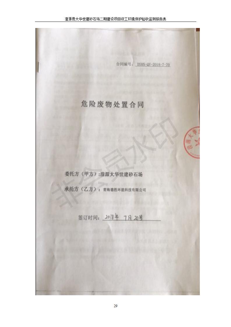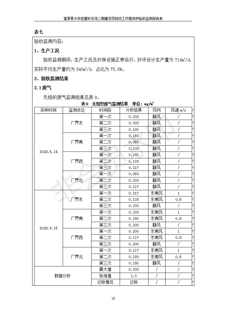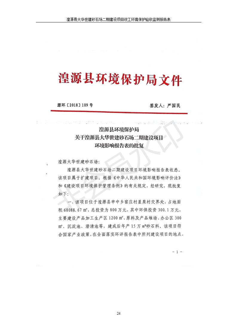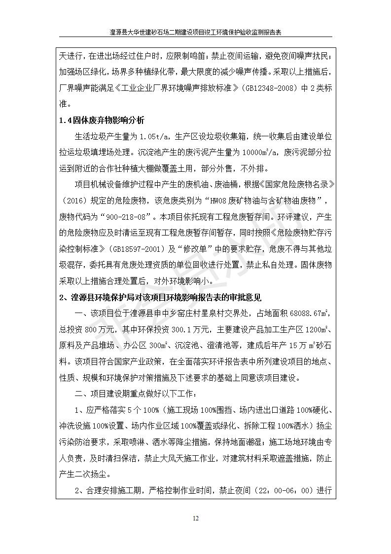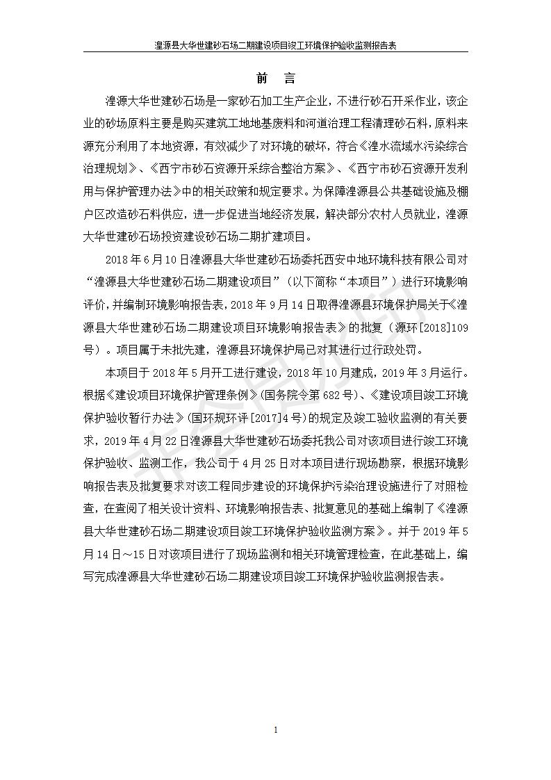 根據(jù)中華人民共和國國務(wù)院令第682號《國務(wù)院關(guān)于修改〈建設(shè)項(xiàng)目環(huán)境保護(hù)管理?xiàng)l例〉的決定》和《建設(shè)項(xiàng)目竣工環(huán)境保護(hù)驗(yàn)收暫行辦法》(國務(wù)院令682號),湟源大華世建砂石場湟源縣大華世建砂石場二期建設(shè)項(xiàng)目(包括竣工環(huán)境保護(hù)驗(yàn)收監(jiān)測報(bào)告表和驗(yàn)收意見)公示如下。 一、項(xiàng)目名稱:湟源縣大華世建砂石場二期建設(shè)項(xiàng)目 二、地點(diǎn):湟源縣申中鄉(xiāng)窯莊村沙崗大小灣 三、建設(shè)單位:湟源大華世建砂石場 四、建設(shè)內(nèi)容:項(xiàng)目主要建設(shè)砂石料產(chǎn)品加工生產(chǎn)區(qū)、原料堆場、產(chǎn)品堆場、辦公區(qū)等。五、聯(lián)系人:張工 六、聯(lián)系電 話:0971-6515411 七、公示時間:二〇一九年七月二十五日至二〇一九年八月二十一日公示期間,對上述公示內(nèi)容如有異議,請以書面形式反饋,個人須署真實(shí)姓名,單位須加蓋公章。