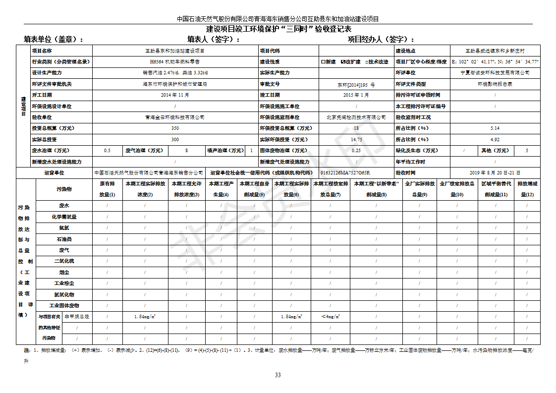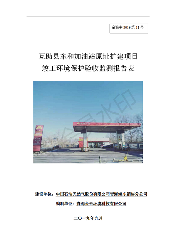 互助縣東和加油站原址擴建項目 竣工環(huán)境保護驗收監(jiān)測報告表公示發(fā)布日期:(2019-9-27) 點擊次數(shù):2504 |