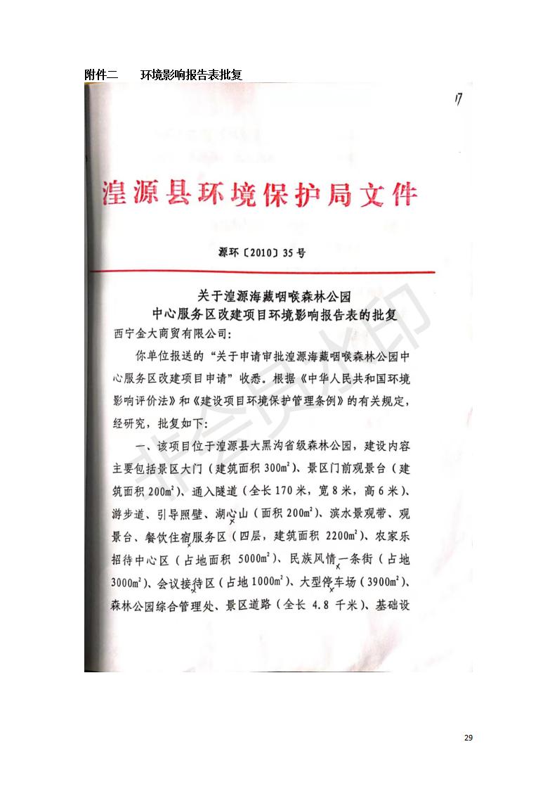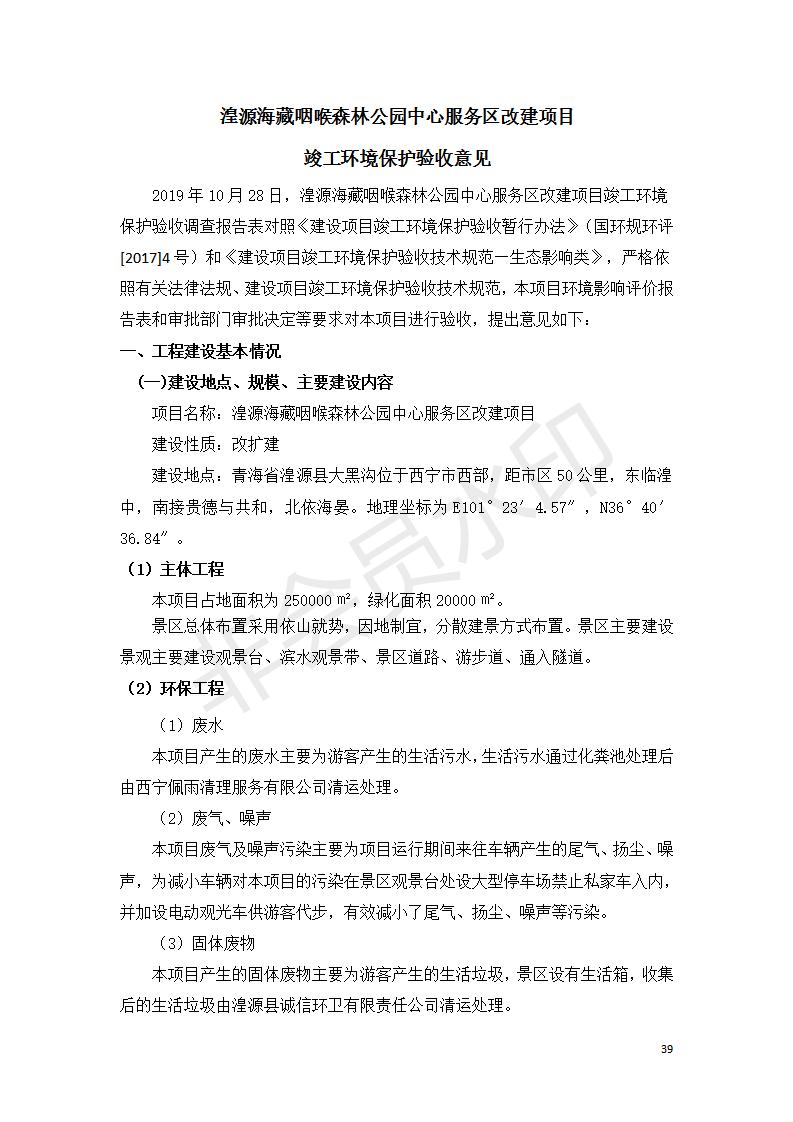 根據(jù)中華人民共和國(guó)國(guó)務(wù)院令第682號(hào)《國(guó)務(wù)院關(guān)于修改〈建設(shè)項(xiàng)目環(huán)境保護(hù)管理?xiàng)l例〉的決定》和《建設(shè)項(xiàng)目竣工環(huán)境保護(hù)驗(yàn)收暫行辦法》(國(guó)務(wù)院令682號(hào)),湟源海藏咽喉森林公園中心服務(wù)區(qū)改建項(xiàng)目(階段性),(包括竣工環(huán)境保護(hù)驗(yàn)收調(diào)查表和驗(yàn)收意見(jiàn))公示如下。 一、項(xiàng)目名稱:湟源海藏咽喉森林公園中心服務(wù)區(qū)改建項(xiàng)目(階段性) 竣工環(huán)境保護(hù)驗(yàn)收調(diào)查表 二、地點(diǎn):青海省湟源縣東峽鄉(xiāng)大黑溝 三、建設(shè)單位:西寧金大旅游開(kāi)發(fā)有限公司 四、建設(shè)內(nèi)容:本次階段性驗(yàn)收以自然景觀為主,建設(shè)內(nèi)容為濱水景觀帶、觀景臺(tái)、景區(qū)道路及基礎(chǔ)設(shè)施。項(xiàng)目范圍從景區(qū)大門(mén)至中心位置,全長(zhǎng)4800m。 五、聯(lián)系人:張工 六、聯(lián)系電 話:0971-6515411 七、公示時(shí)間:二〇二〇年四月二十九日至二〇二〇年五月二十八日 公示期間,對(duì)上述公示內(nèi)容如有異議,請(qǐng)以書(shū)面形式反饋,個(gè)人須署真實(shí)姓名,單位須加蓋公章。