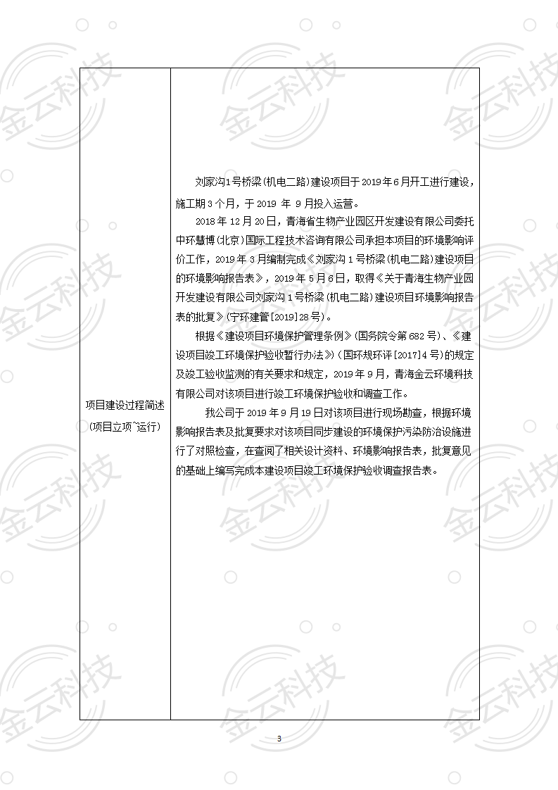 根據(jù)中華人民共和國國務院令第682號《國務院關(guān)于修改〈建設(shè)項目環(huán)境保護管理條例〉的決定》和《建設(shè)項目竣工環(huán)境保護驗收暫行辦法》(國務院令682號),劉家溝1號橋梁(機電二路)建設(shè)項目竣工環(huán)境保護驗收調(diào)查表,(包括竣工環(huán)境保護驗收調(diào)查表和驗收意見)公示如下。 一、項目名稱:劉家溝1號橋梁(機電二路)建設(shè)項目竣工環(huán)境保護驗收調(diào)查表 二、地點:青海省西寧市城北區(qū)生物園區(qū) 三、建設(shè)單位:青海生物產(chǎn)業(yè)園開發(fā)建設(shè)有限公司 四、建設(shè)內(nèi)容:本項目主要建設(shè)內(nèi)容為橋梁工程、接線路基等工程。項目南北走向,北起機電二路,南至寧張路,項目全長150m. 五、聯(lián)系人:張工 六、聯(lián)系電 話:0971-6515411 七、公示時間:二〇二〇年六月二日至二〇二〇年六月三十日 公示期間,對上述公示內(nèi)容如有異議,請以書面形式反饋,個人須署真實姓名,單位須加蓋公章。 |