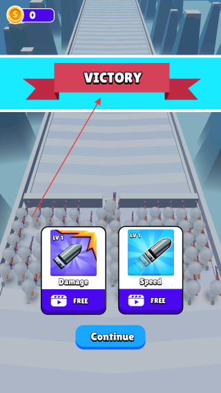 4、成功通關(guān)后,點擊【Continue】繼續(xù)游戲,可選擇提升【Damage】或【Speed】,為后續(xù)關(guān)卡增強(qiáng)實力。