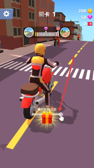 1、在【關(guān)卡-1】中,駕駛摩托車時留意路上的禮物盒,收集資源,為提升摩托車性能和競速排名做準備。